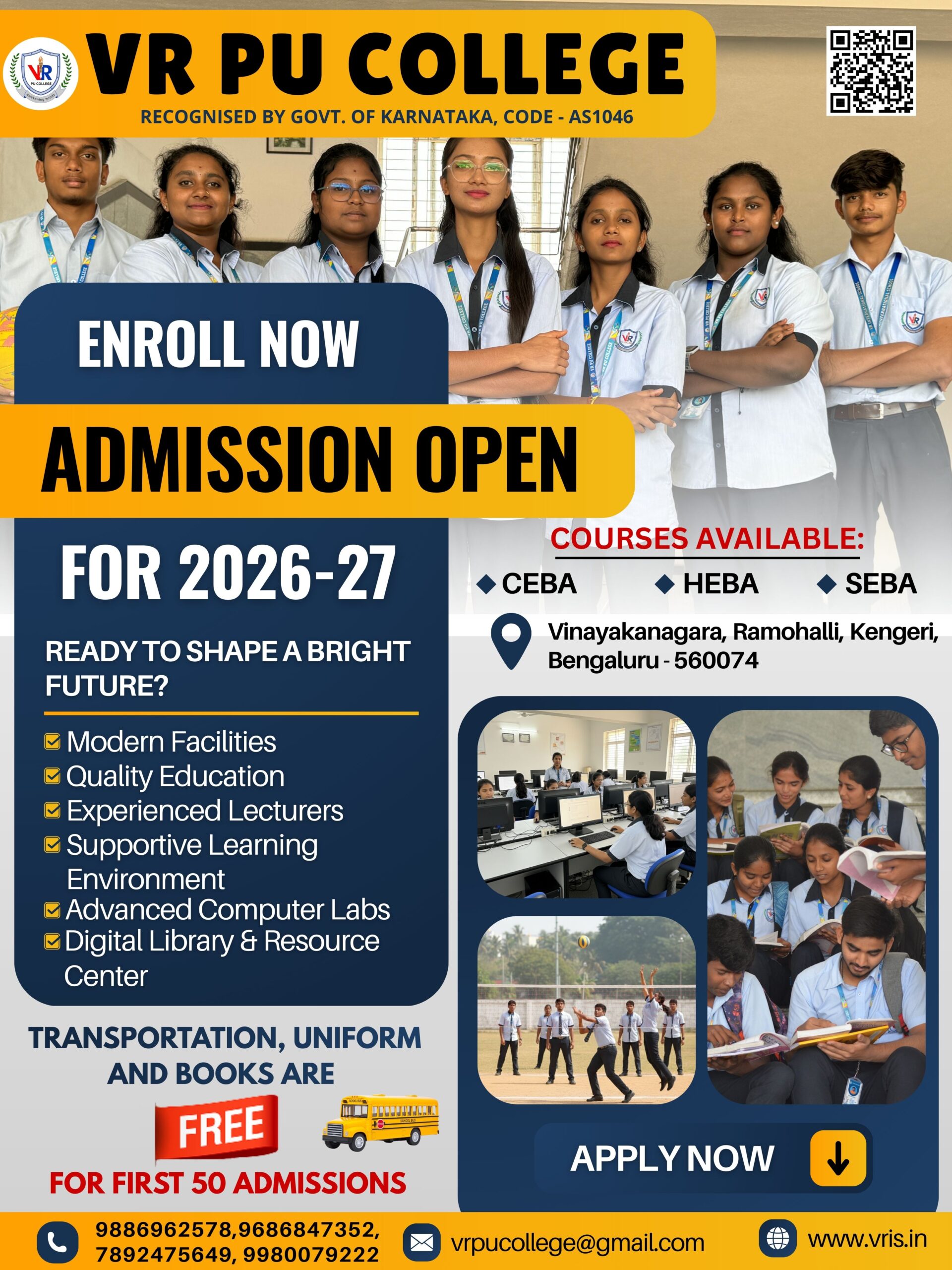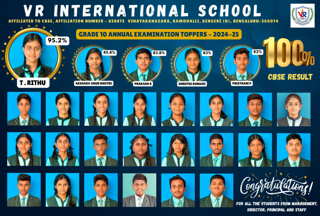 VR International School, established in 2016, is a co-educational English medium school founded by VR Educational Trust. The school follows the CBSE curriculum, while VR PU College, a government-recognized institution, offers the State Board Commerce stream. Our institution is designed to provide quality education to students from diverse social, cultural, and economic backgrounds. With a team of caring and dedicated teachers, we follow a child-centered approach that encourages students to think freely, learn confidently, and grow academically as well as personally. At VR International School, we focus on nurturing strong values such as integrity, honesty, compassion, trust, and tolerance, ensuring that every child receives equal opportunities to develop according to their abilities and potential. We are committed to shaping responsible, confident, and successful individuals for the future.
